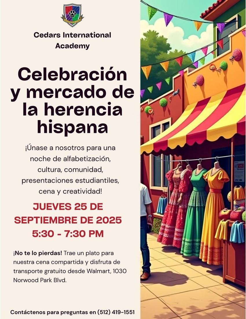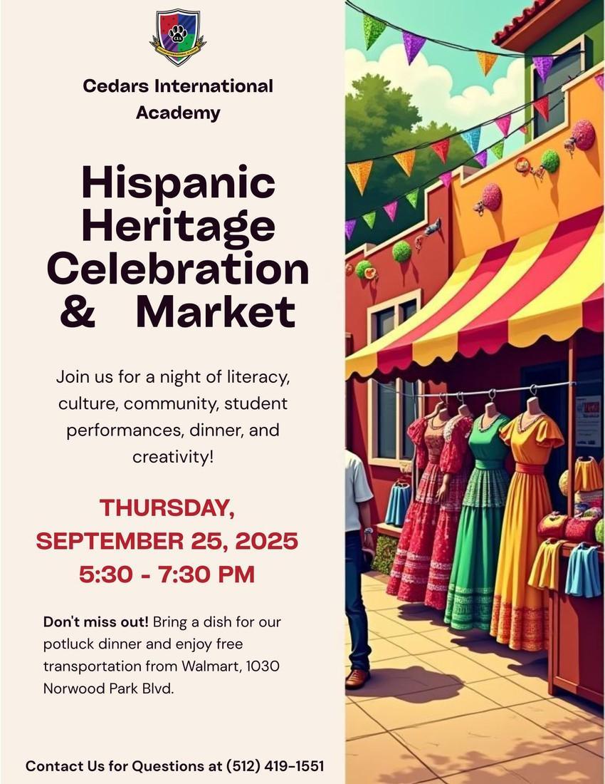 We are thrilled to invite you to our Family Literacy Night & Hispanic Heritage Celebration at Cedars International Academy! This exciting evening will bring our community together to celebrate culture, reading, and family pride. Families will enjoy student performances, music, food, and a vibrant showcase of Hispanic heritage.