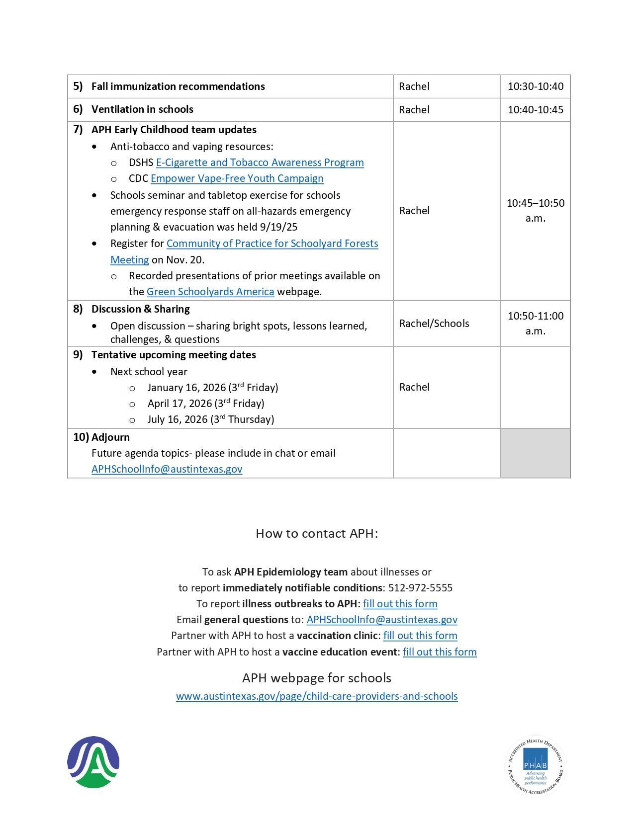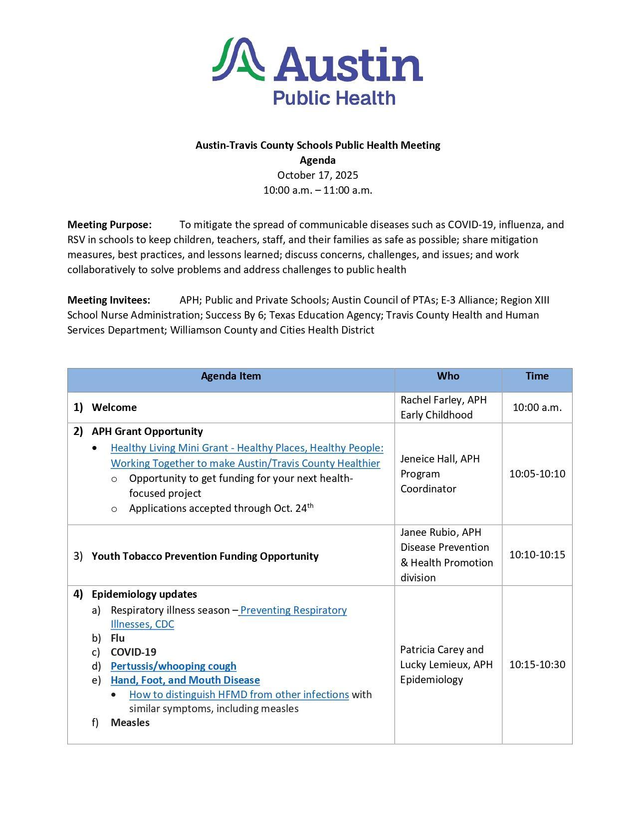 Please take a moment to review the attached informational flyers from Austin Public Health, which include details on: