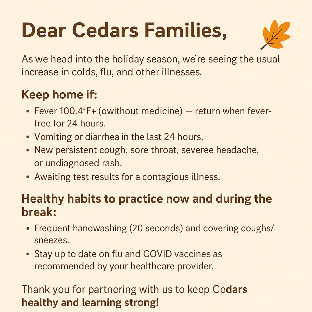 As we head into the holiday season, weāre seeing the usual increase in colds, flu, and other illnesses. Please help us keep our students and staff healthy now and during Thanksgiving Break November 24-28, 2025, by reviewing these quick reminders: