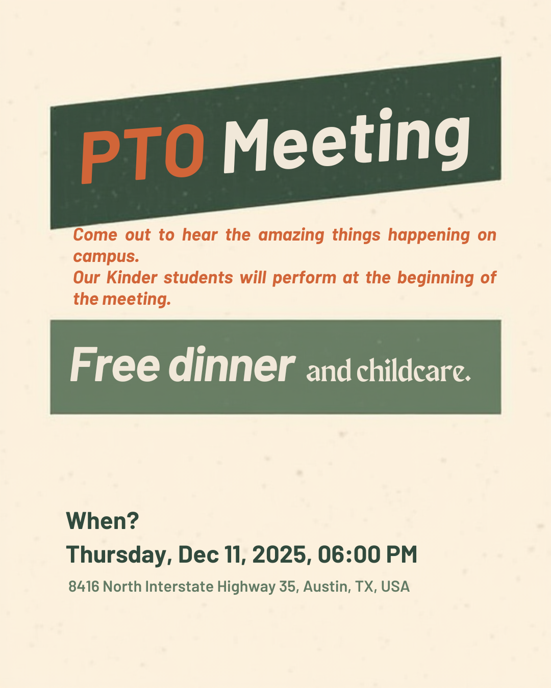 Come out to hear the amazing things happening on campus. Our Kinder students will perform at the beginning of the meeting. We will have free dinner and childcare.