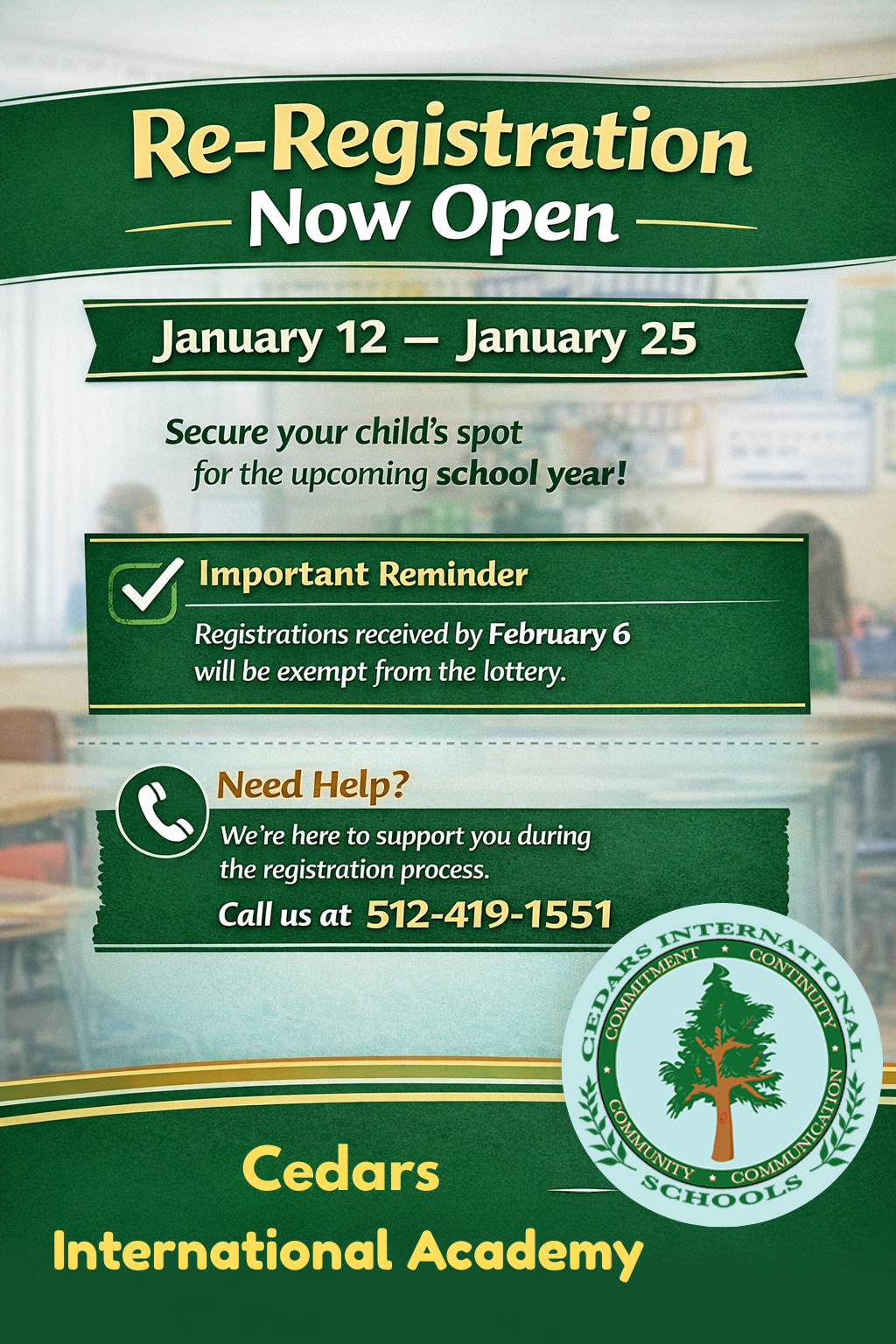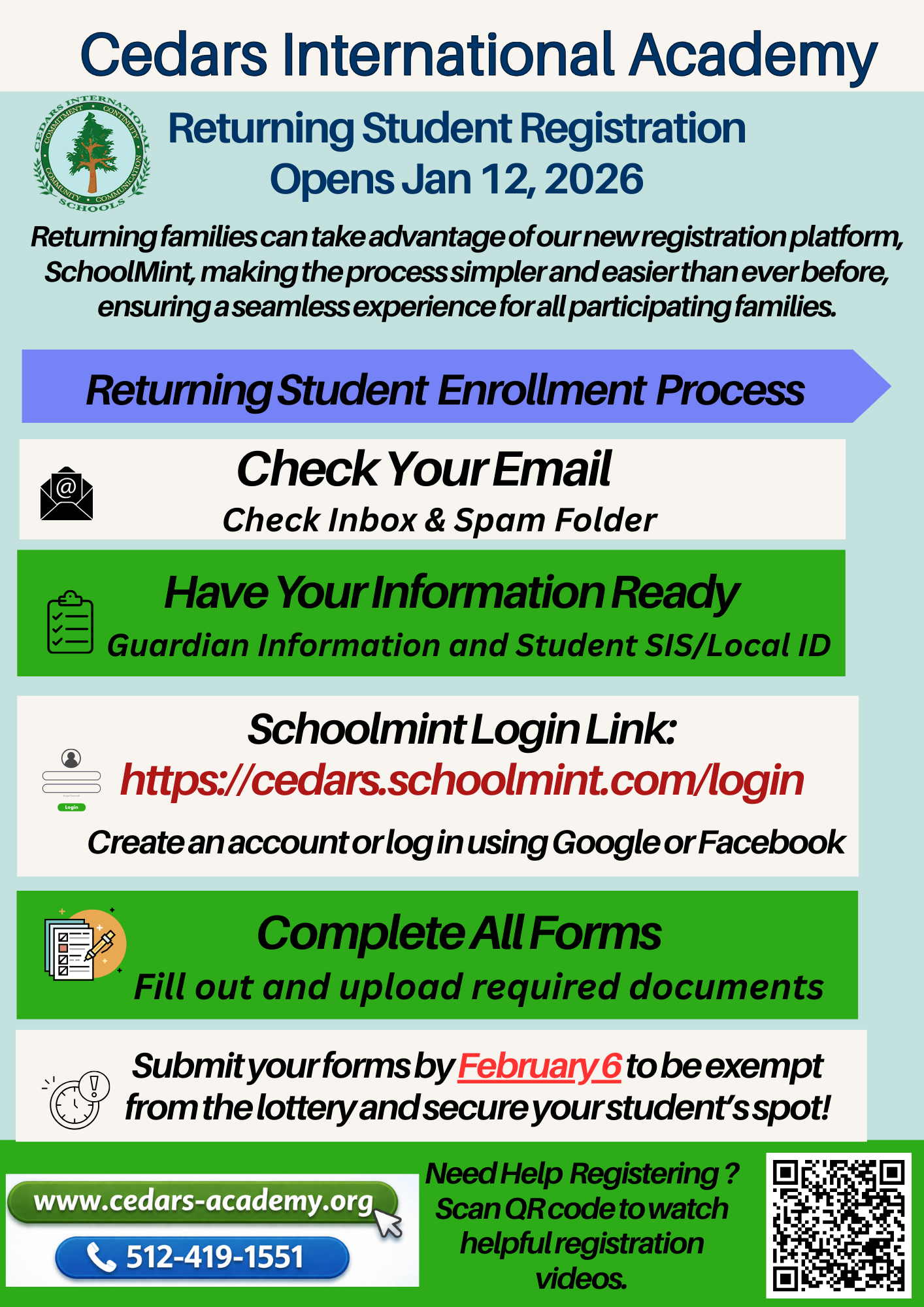 Thank you for your continued partnership. We look forward to another successful school year at Cedars International Academy. Please donāt hesitate to reach out if you need assistance.