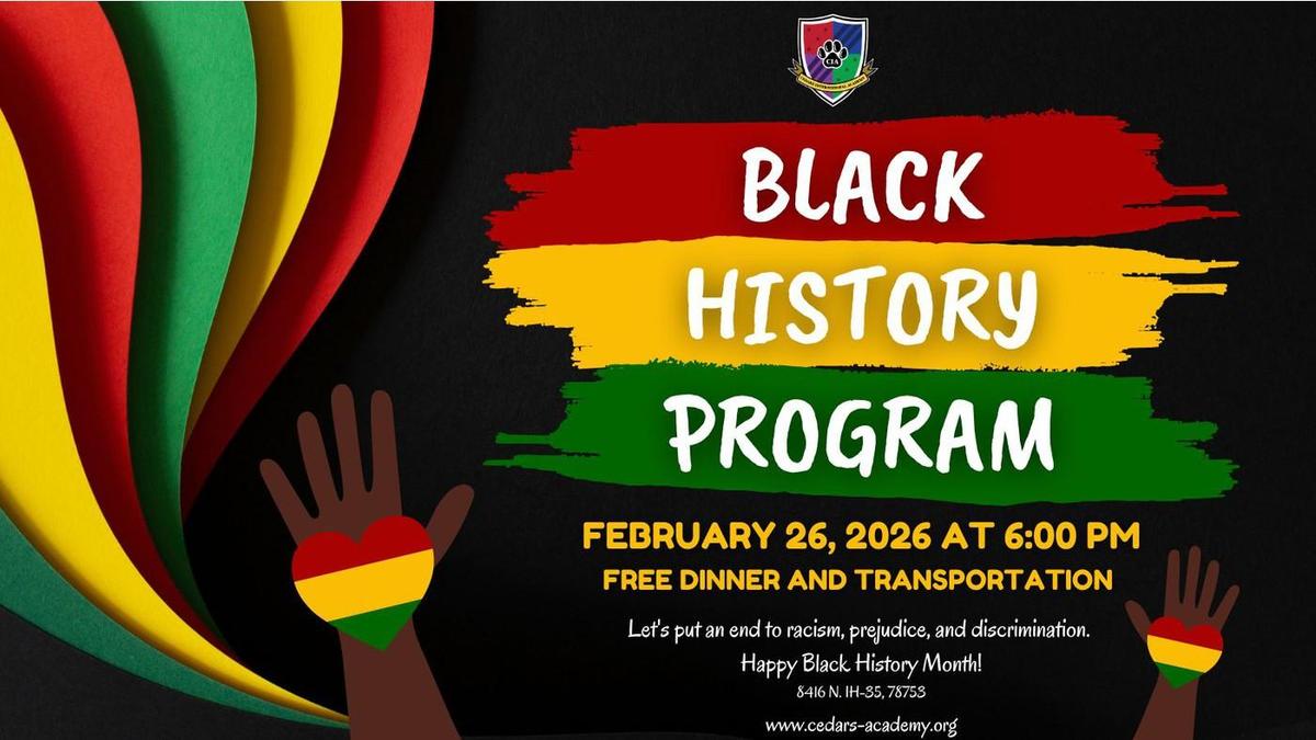 We are excited to invite our Cedars families to our Black History Month Celebration at our new campus. This special evening will honor Black history and culture through student performances and presentations.