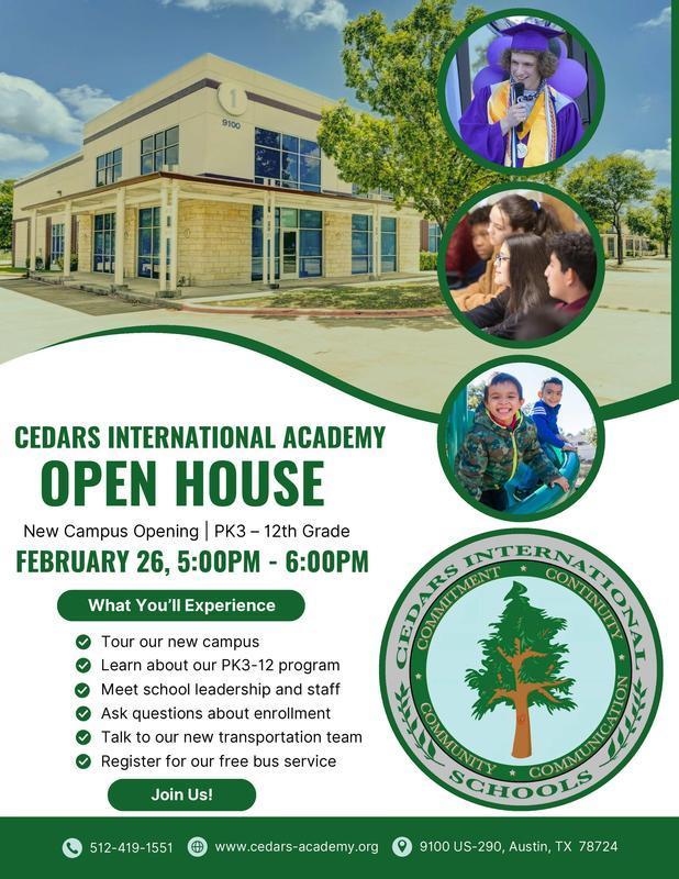 Prior to the celebration, we will host an Open House starting at 5:00 PM, which is open to both current and prospective families. We encourage you to invite friends, neighbors, and families interested in enrolling at Cedars International Academy to attend the Open House and learn more about our school and new campus.