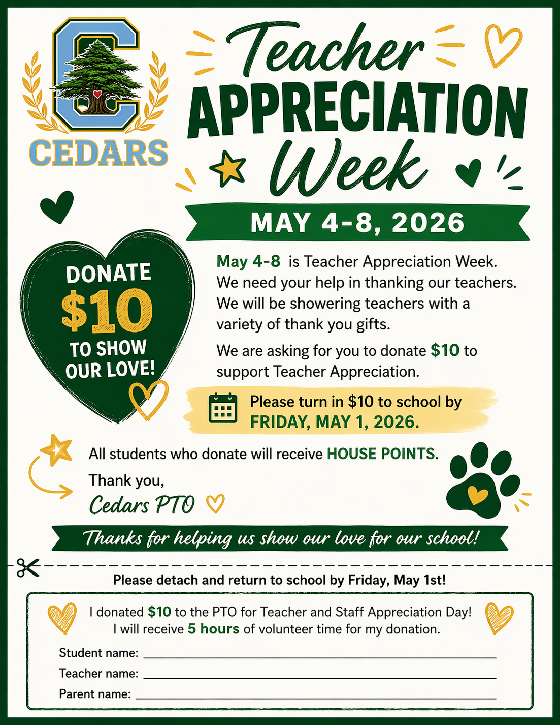 Our PTO is organizing a week full of appreciation, and we are asking for your support. We kindly request a $10 donation to help provide thoughtful gifts for our teachers.